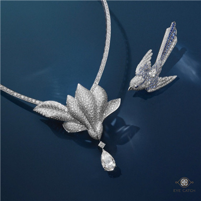 其中一件山雀(Chickadee)造型胸針,創作靈感來自生活在北美地區的小型鳥類,設計師別出心裁地塑造出山雀俯衝而下的飛翔姿態,鑲嵌圓形切割藍寶石勾勒出分明的羽毛紋路,中央鑲嵌一顆超過1ct水滴形鑽石,經鑒定為 E 色和 VVS2 淨度營造出熠熠閃光。尖尖的鳥喙採用鏡面拋光白金潤飾,搭配弧面切割的藍寶石眼眸,純淨動人,如同帶來幸運的珍寶