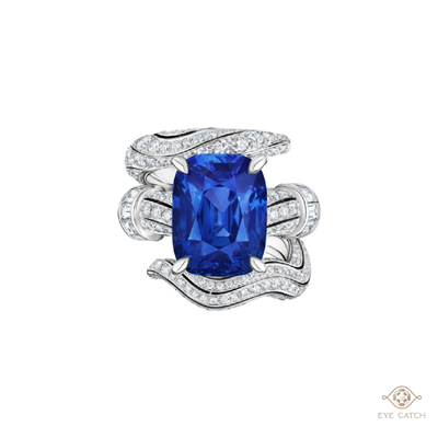 Virtuosity頂級珠寶系列,其中由藍寶石作為主要發揮寶石的《Motion 流動》,便是第二篇章「The World of Creativity(創意世界)的主秀。Motion藍寶石戒指,鑲嵌1顆古董枕形階梯式切割藍寶石,搭配白金戒圈塑造出流線起伏的波浪形態,中央鑲嵌一顆枕形藍寶石,讓人聯想到連綿不絕的海浪。