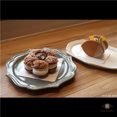兩款甜點都好可愛, 菠蘿酥皮泡芙殼做成花形, 海鹽奶霜擠得圓滾滾, 焦糖醬還用金箔點綴, 令人意外的是中間還有放奶茶酥餅之類增加酥脆口感, 不至於很快膩! 檸檬外型的黃檸檬是用兩片檸奶油酥餅夾餡, 整體酸度偏高不甜膩