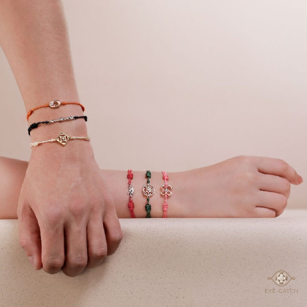我們也很推薦,紅色鑽好運手鍊與粉紅色系、褐色系、深藍色、米白色手鍊層次搭配。相信不同的顏色,搭配不同圖騰的寓意,更能夠讓我們幸運加倍!