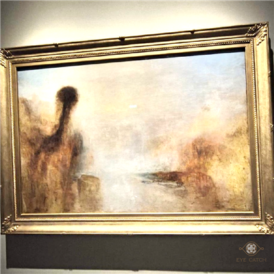 第二幅海面細節畫作,金光打在水面上,波紋宛若液態的鏡子。看似平靜,卻在光影交錯間隱藏無數暗潮。這種微妙的層次感,讓人不自覺停下腳步凝視,透納的魔法;能把光線當顏料,把空氣畫成形體,把時間凝結在水的表面。