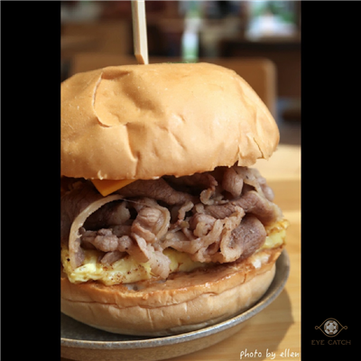 花醬雪花牛肉堡, 原本應有生菜, 但弟弟他們不太讓小朋友吃所以將高麗菜絲去除, 牛肉不少稍微需要嚼, 靠切達起司片還有花生醬提味