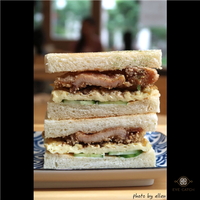 酥炸雞腿蛋三明治, 吐司烤到表面酥脆口感不錯, 雞腿排是傳統裹地瓜粉乾炸那種不是很大片, 小黃瓜存在感很搶眼, 美乃滋不會太多, 整體來說是樸實滋味