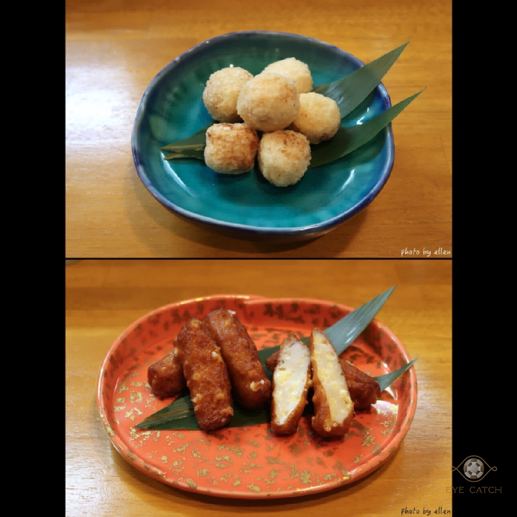 點了: 炸起士魚餅, 炸里芋, 溫泉蛋熱沾麵, 招牌Tsururu烏龍麵; 兩樣開胃菜很下酒, 尤其起士魚餅意外好吃