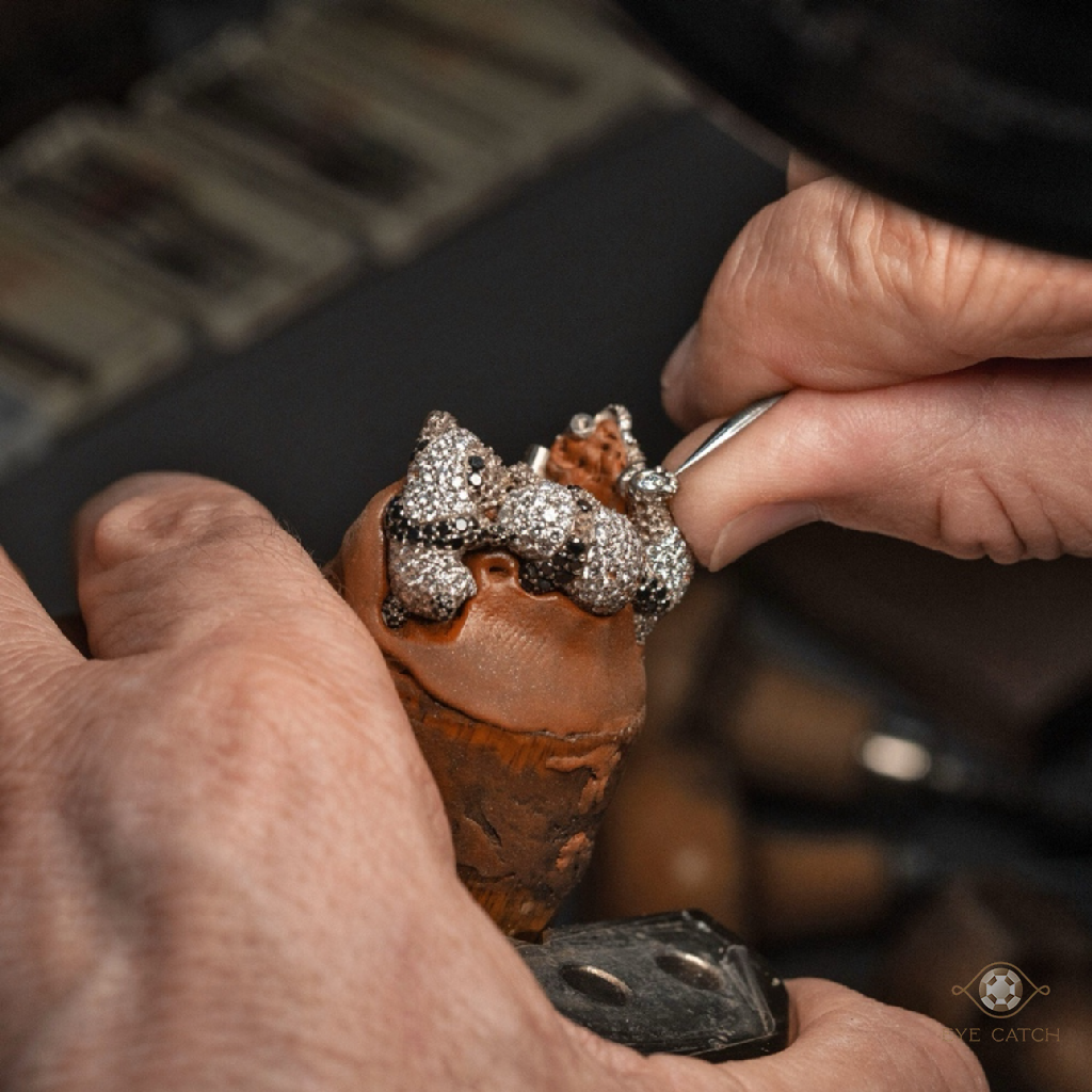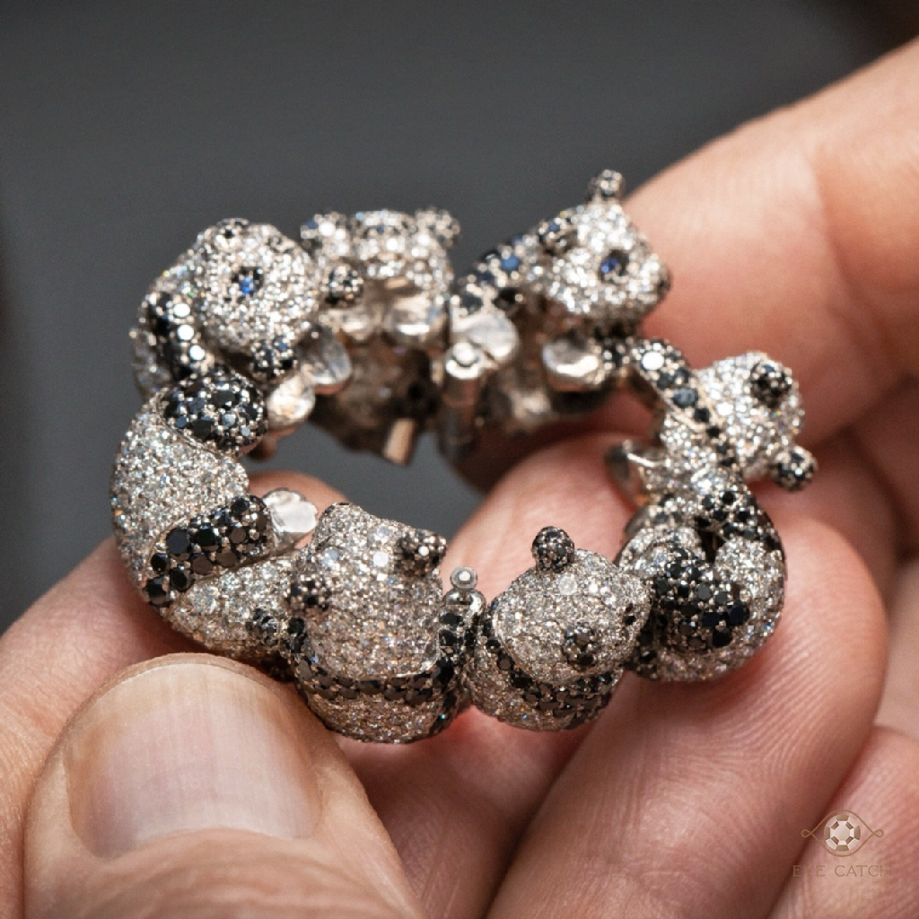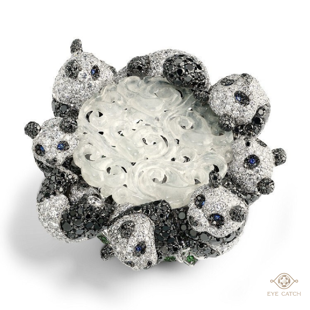 EyeCatch 蕭邦大熊貓高級珠寶 Chopard 在2025年「Red Carpet」高級珠寶系列中推出這枚雞尾酒戒指,最特別之處是設計上另辟蹊徑,以覆雜鑲嵌工藝和雕刻翡翠戒面塑造出「大熊貓幼崽圍坐一桌」的萌趣場景。 設計師運用黑白雙色鉆石來塑造大熊貓的可愛體態——頭部和身體均由白金打造,鑲嵌鉆石造型圓潤而飽滿;四肢、雙耳、心形鼻尖和標志性的「黑眼圈」則由黑鉆鋪陳;眼睛鑲嵌圓形切割藍寶石成為點睛之筆,展現靈動的神采。 白色翡翠主石種水優質,采用傳統團花紋飾,主石周圍環繞著8只大熊貓幼崽,如同發現了珍貴的寶藏,或左顧右盼,或好奇地鉆到翡翠背面,萌趣的神態令人忍俊不禁。白金戒壁鋪鑲沙弗萊石,如同青翠的竹葉,令整件作品更具東方氣韻。 圖片來源 Chopard 官網 9