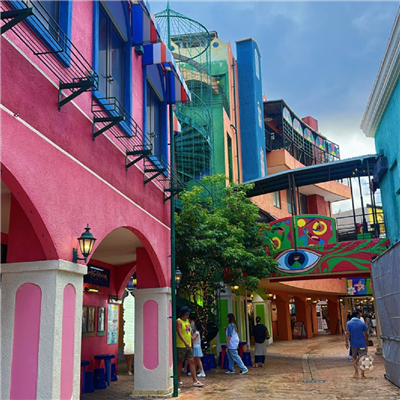 這裡一切都像是一場混搭派對🎉走在色彩繽紛的街道上,眼前是亮麗的招牌、塗鴉與奇妙的裝置藝術,從巨眼企鵝公仔到復古車,每一角落都充滿驚喜。轉個彎,就能看到牛仔雕像揮著帽子,下一秒又能在舞台假裝搖滾巨星開唱。這裡沒有嚴肅的規則,只有滿滿的玩心與創意。