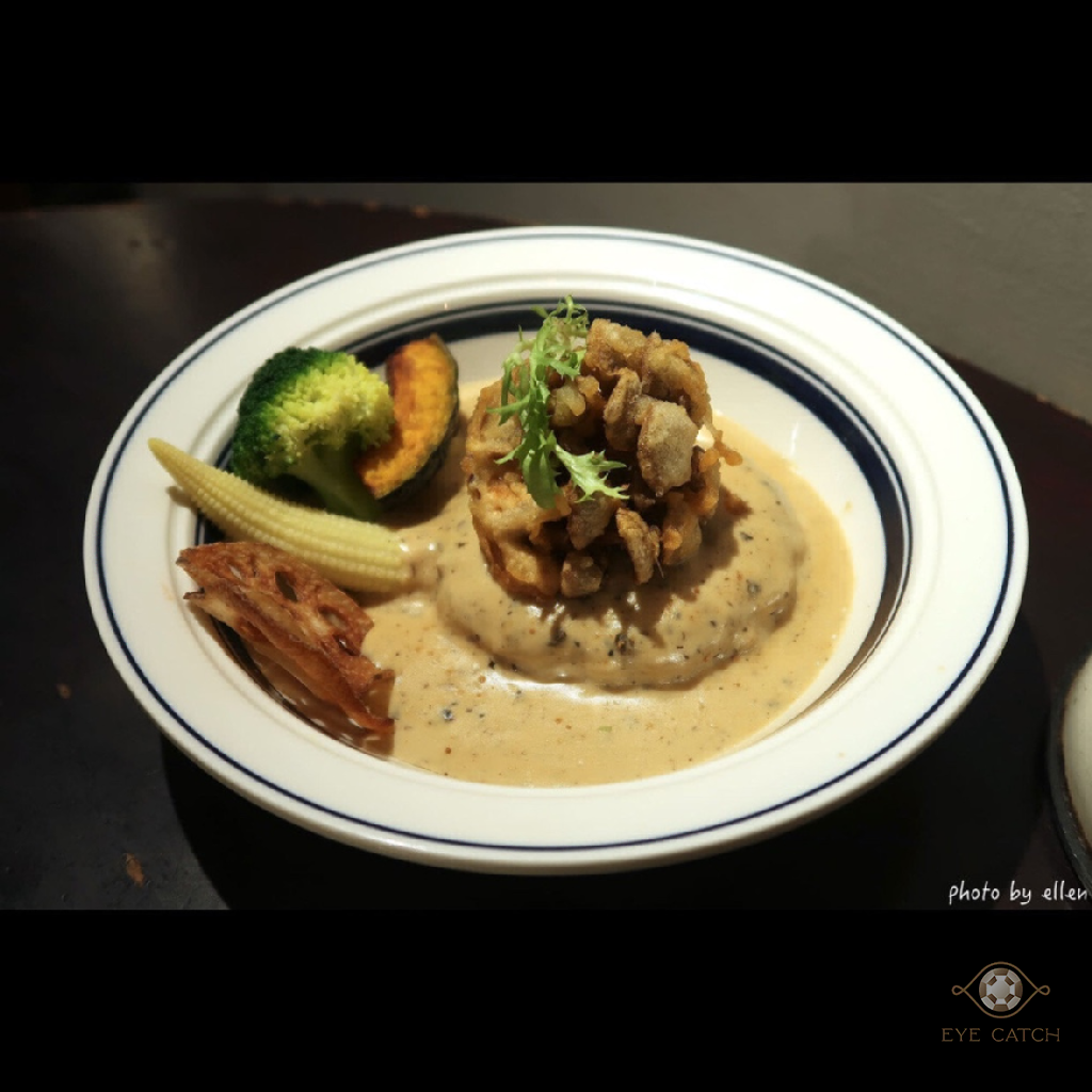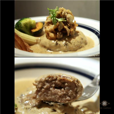 當初就是被漢堡排給吸引, 滿滿松露味噌醬還有炸蕈菇都是我愛的, 漢堡肉排軟嫩多汁肉香濃厚, 松露醬奶味重吃多易膩, 不過配著炸蕈菇和旁邊附的蔬菜與米飯還是吃光光 ;)