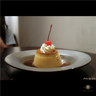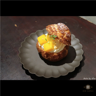 布丁軟嫩, 奶香與蛋香淡淡, 焦糖醬裡加了白蘭地且煮得偏苦, 而芒果泡芙是當季甜點, 除了香緹鮮奶油還有質地偏稠的卡士達, 點綴的堅果碎和芒果塊非常加分