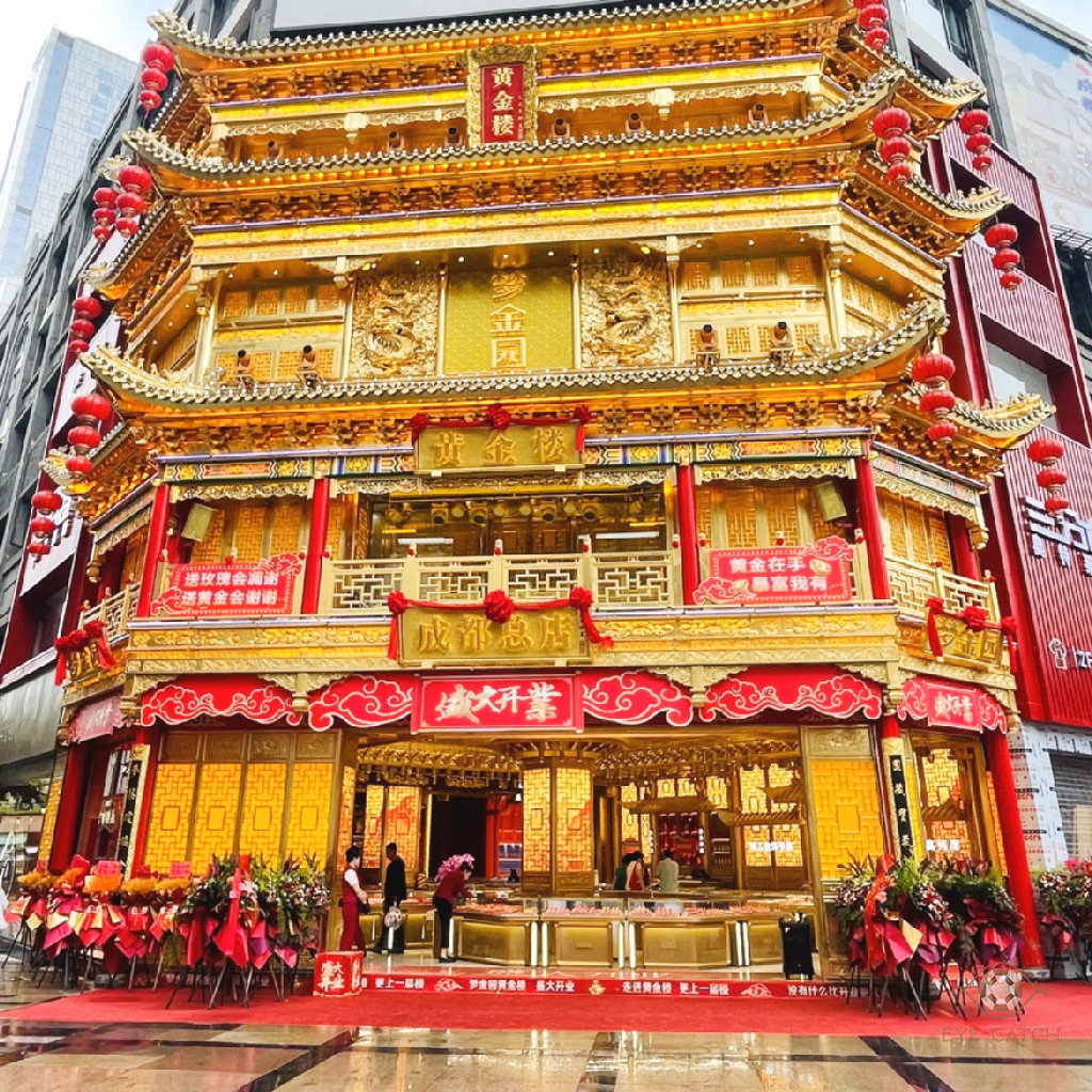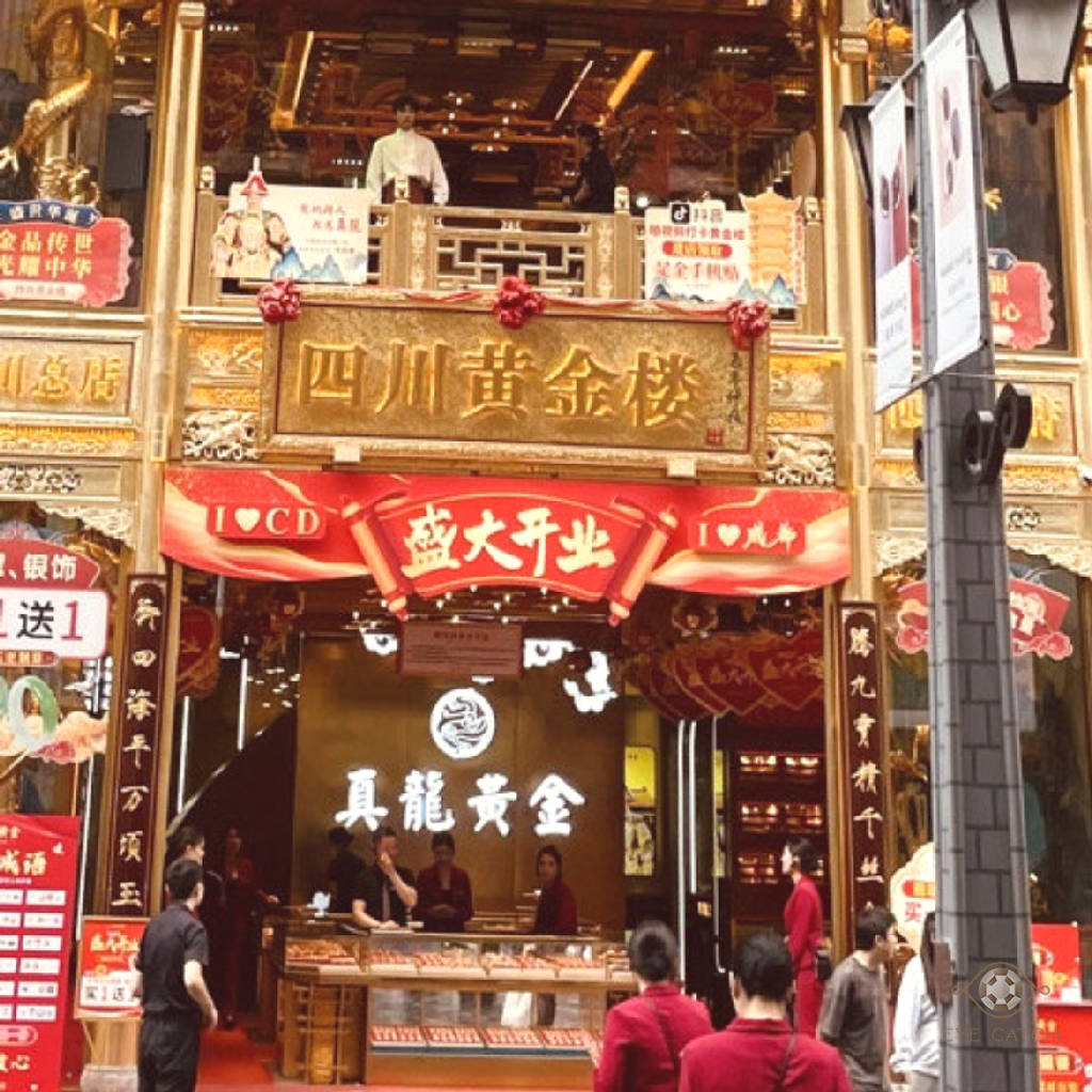 走在春熙路商業街,就能看到一棟棟浮誇得像皇宮的珠寶樓,一層又一層金光閃閃,紅燈籠垂滿屋檐,像是「財神降臨」現場版。