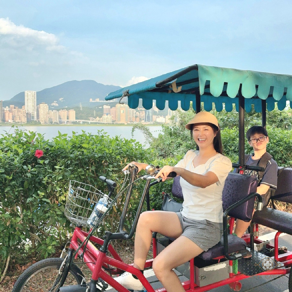 先租一台超Q的四輪電動腳踏車,邊踩邊吹海風,河面閃著光、小孩在後座興奮狂笑,真的很開心愜意~🥳