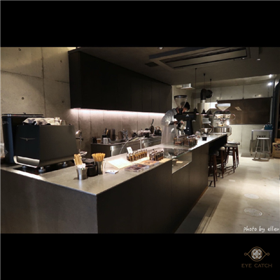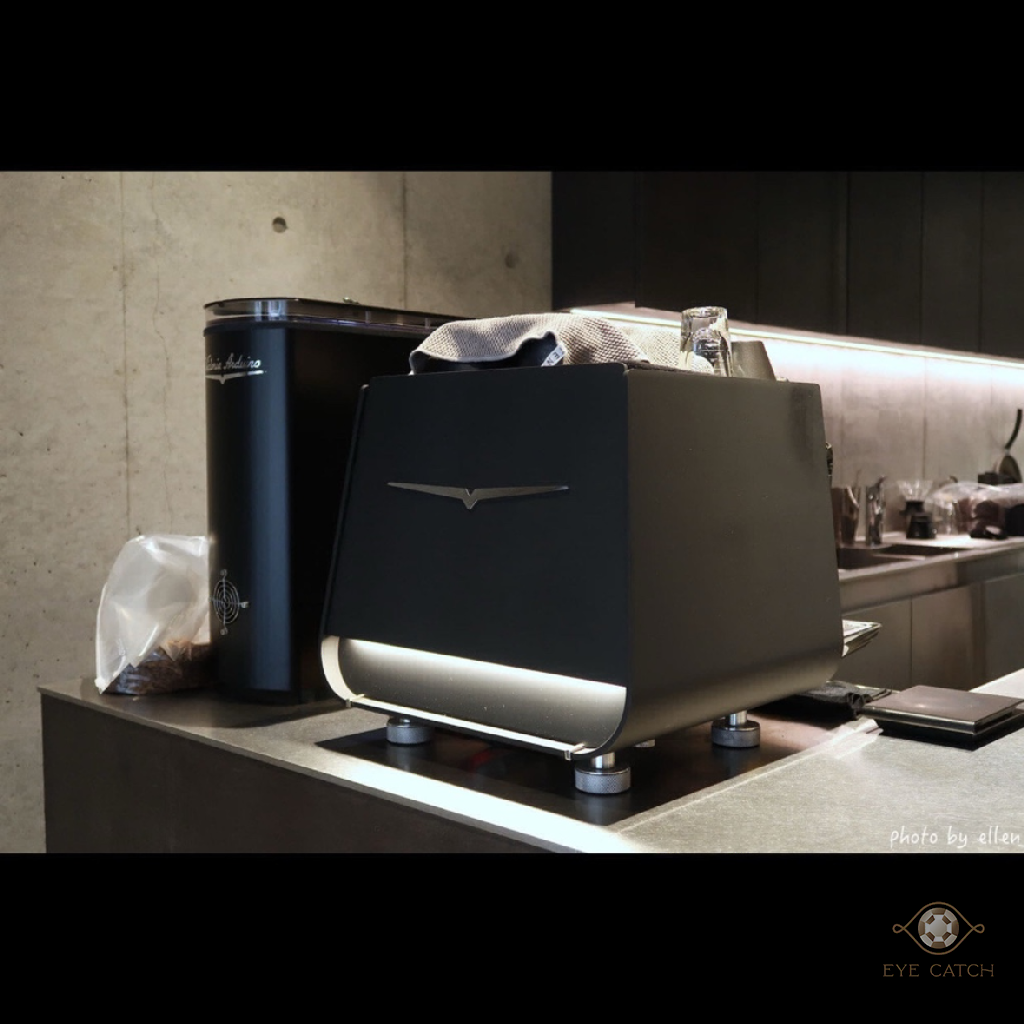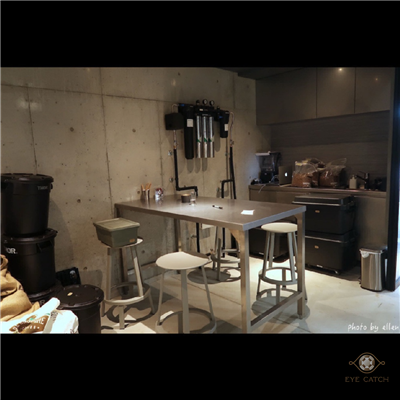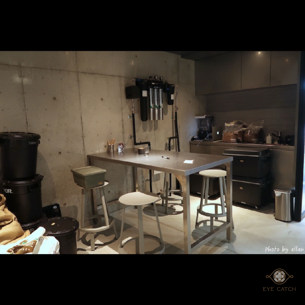 灰色調的實驗室氛圍, 有趣的是咖啡師身穿白長袍, 完全是研究員模樣 XD 吧台四個位子, 裡面方桌可坐兩人, 烘豆機直接擺在一角, 另個空間同樣像實驗室有四個位子, 猜測老闆應該是在這挑豆之類