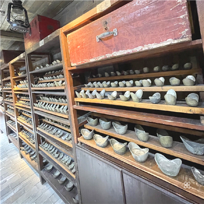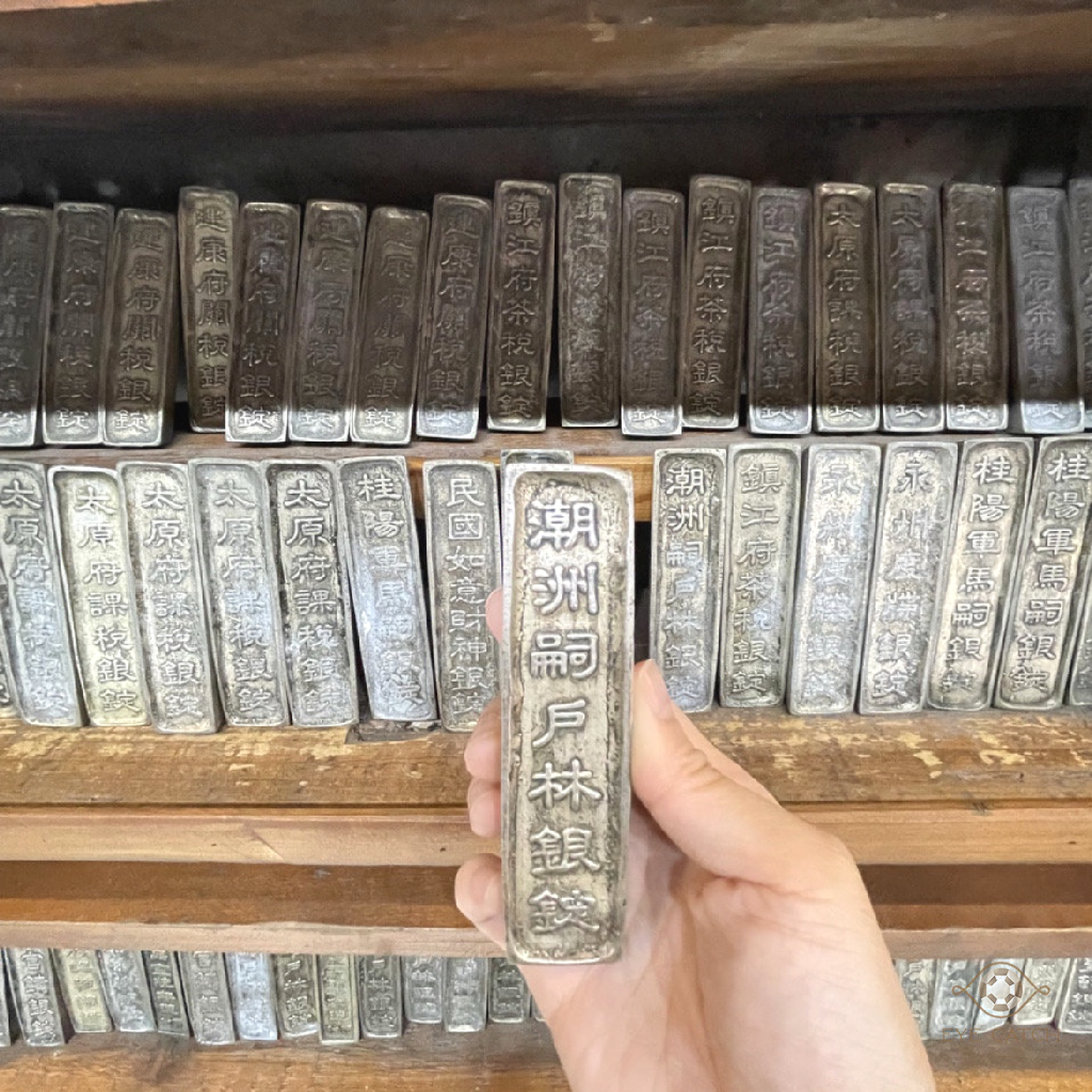一樓「銀庫」,滿滿一整牆的銀錠、銀條、銀塊,閃著歷史的金屬光澤,每一個都刻有不同朝代的印記。
