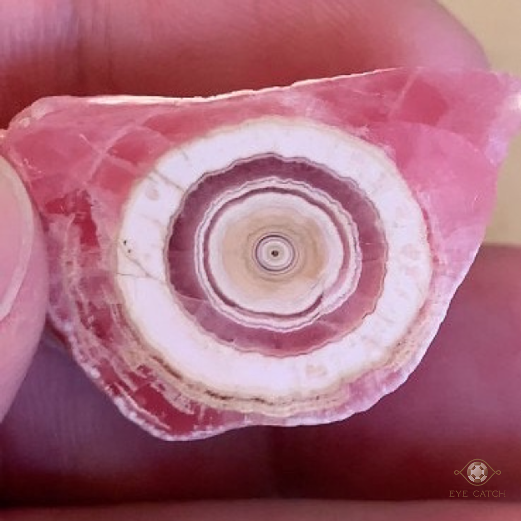 菱錳礦長成塊狀的多晶集合體,顏色為粉紅色,長成條帶狀,有白色或黑色條帶,層與層之間的邊界,常為鋸齒狀或尖頭狀,相鄰的層,因顏色光澤和晶體的定向,差異顯現結構分明。