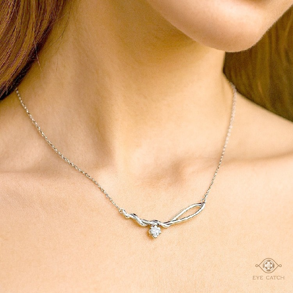 整件作品以流線交錯的結構設計,兩道曲線纏繞象徵相遇與連結,在交匯處懸掛一顆璀璨鑽石,突顯亮麗的風格。