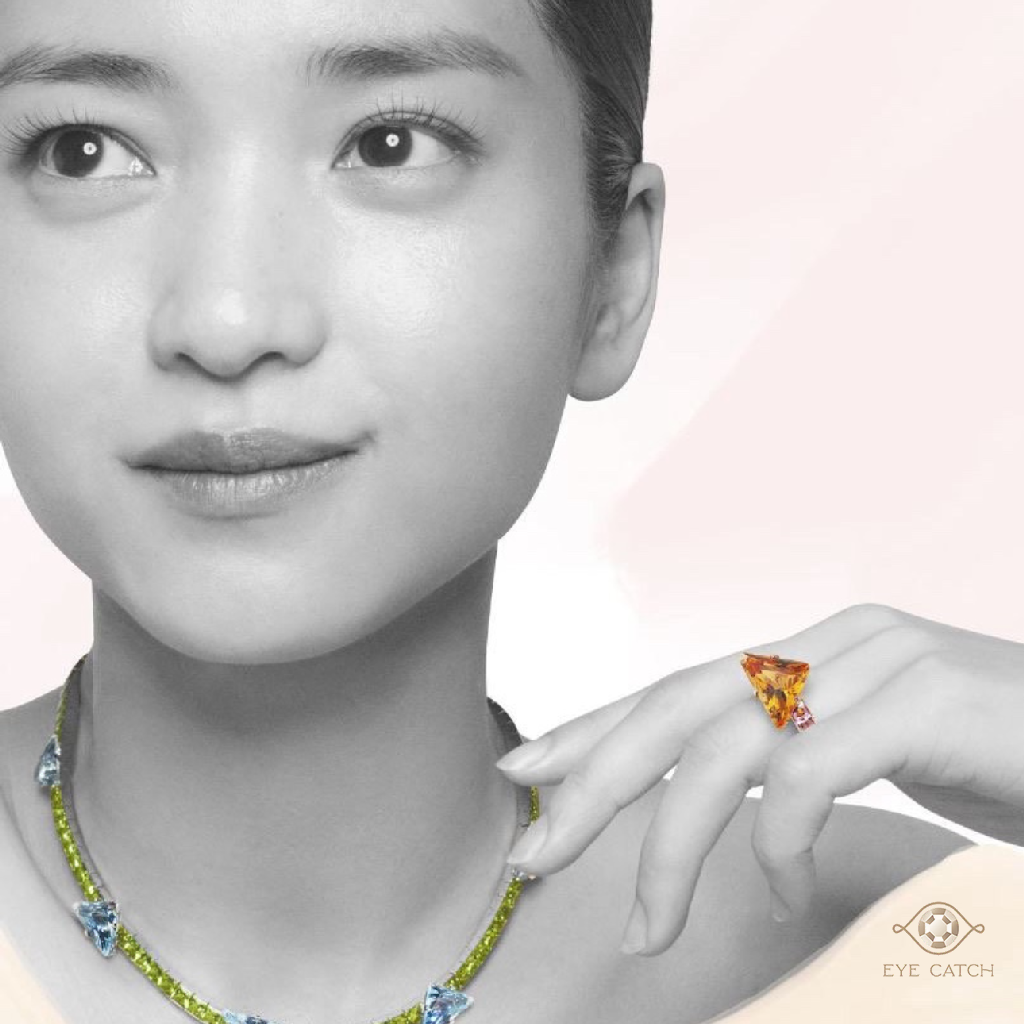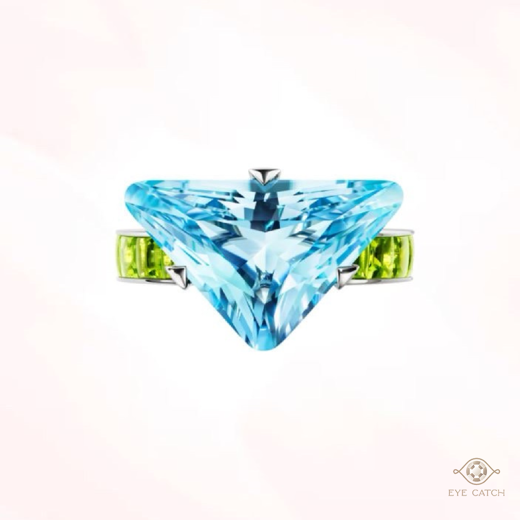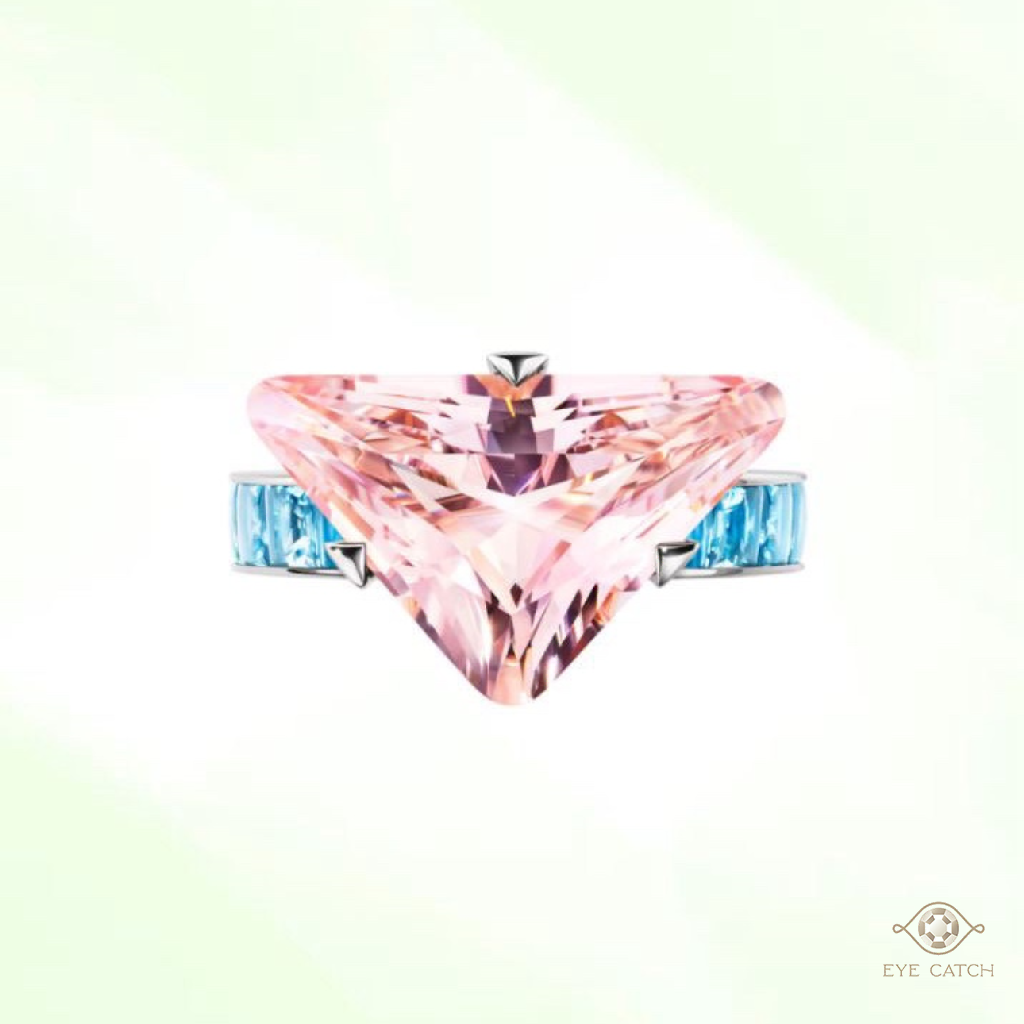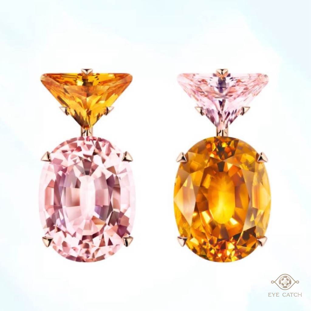 其中的戒指品項,以一顆三角形切割彩色寶石為主石,搭配鑲嵌階梯型切割寶石的永恆式戒圈,並推出四種撞色/互補色配色的珠寶作品。