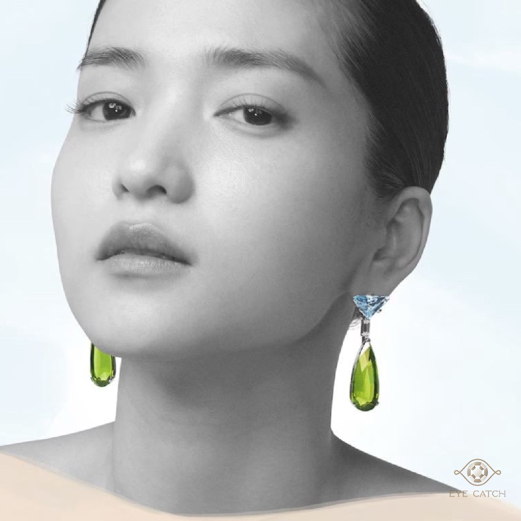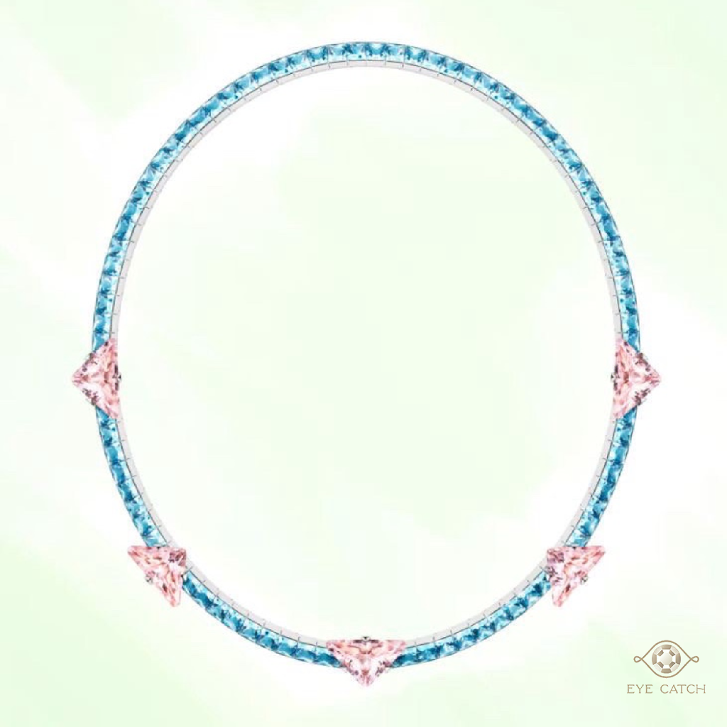 垂墜耳環、rivière項鍊與單石戒指在影像與色彩的交織中,如同自由綻放的藝術品,同時借助區塊鏈技術確保真實性與永續價值。展現色彩與幾何的雙重張力。