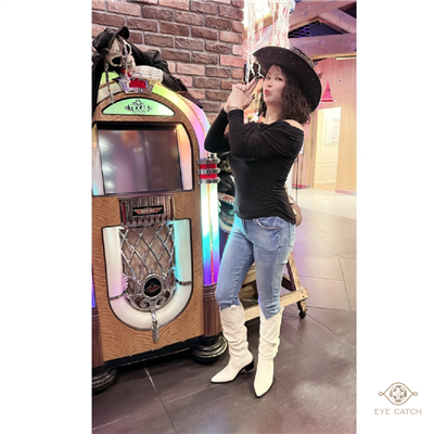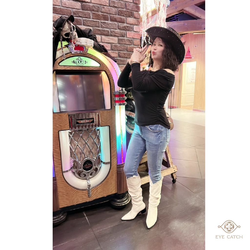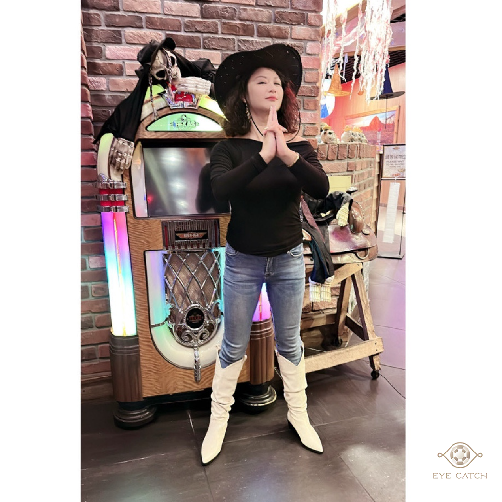 我點了一大杯血紅色調酒,舉杯的瞬間像是在跟節日乾杯。穿著應景的黑帽、亮片耳環、白靴與牛仔風裝,邊聊天邊拍照。萬聖夜像是一場小型嘉年華,充滿幽默、華麗、微醺,完美收尾十月的夜。