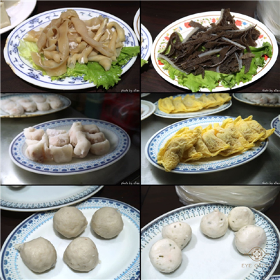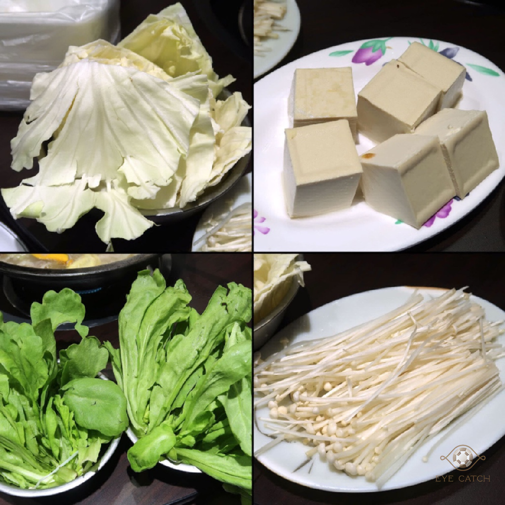 選了: 牛肉/高麗菜/金針菇/水豆腐/鴨腸/牛肚/大白菜/排骨酥/芋頭/魚餃/蛋餃/手工花枝蝦漿/香菇肉丸/蟹黃包/茼蒿