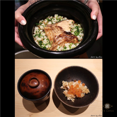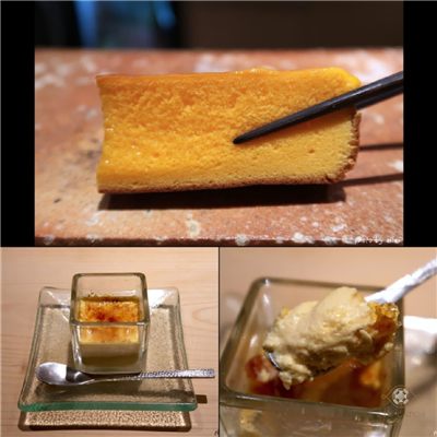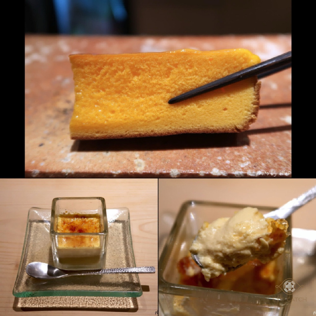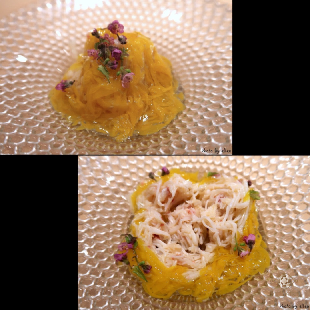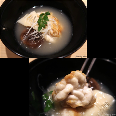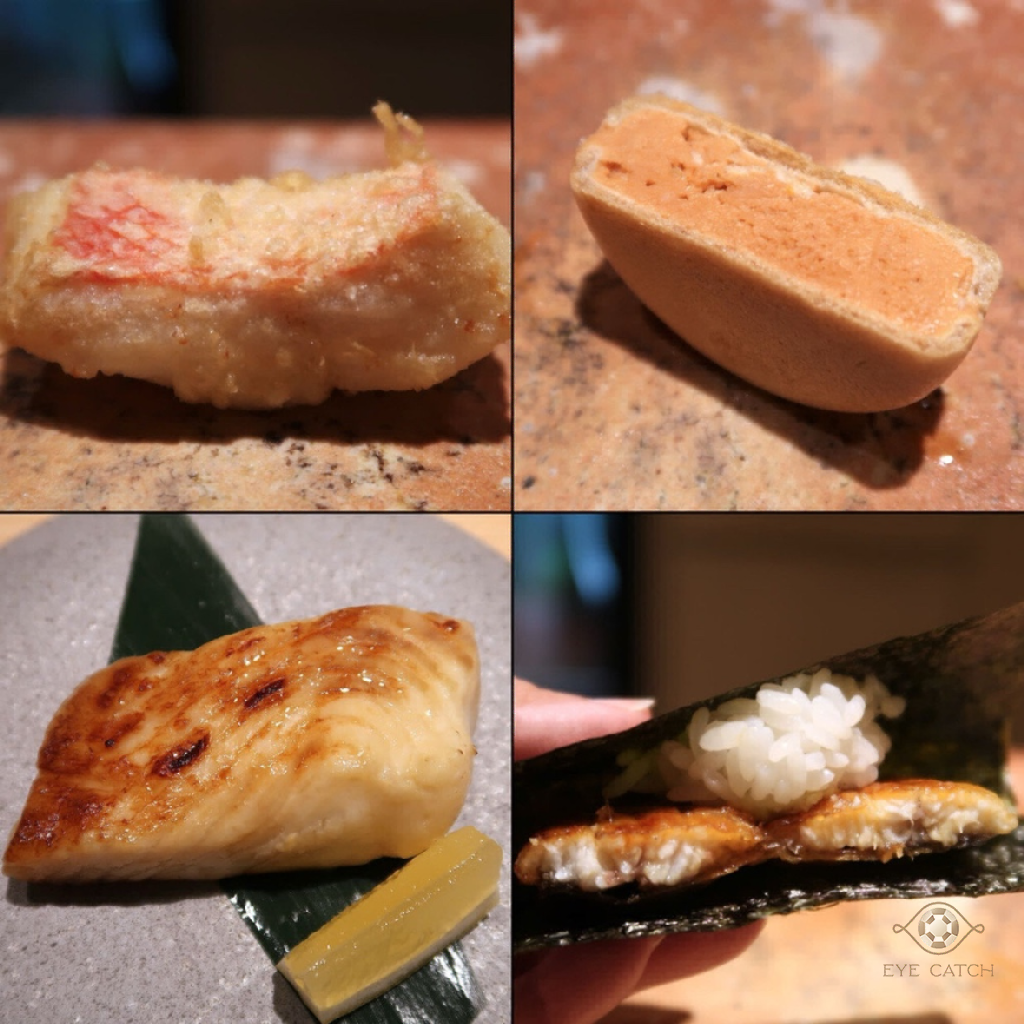 本日餐點: 北海道毛蟹菊花醋凍紫蘇花, 旺旺仙貝, 北海道鱈魚白子, 九州真鯛, 長崎黑鮪魚大腹, 金目鯛天婦羅, 台灣野生午仔魚, 北海道鮟鱇魚肝最中, 鰈魚西京燒, 黑鮪魚赤身, 鹿兒島白鰻, 赤海膽, 日本富山冰劍獅魚下巴釜飯&味噌湯, 玉子燒, 胡麻烤布蕾