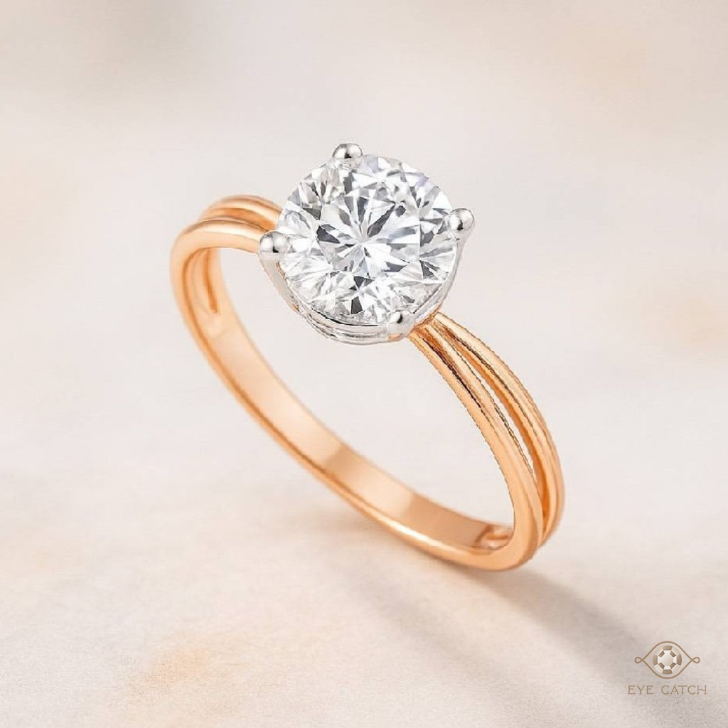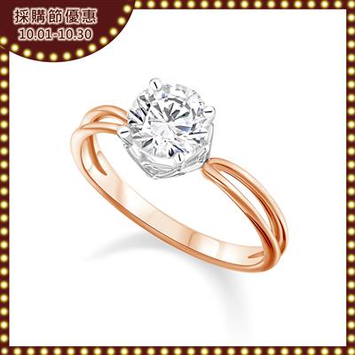 這款純真鑽石戒指以簡約線條勾勒柔美弧度,玫瑰金戒環溫潤細膩,搭配白K金鑲座,讓主鑽的光芒更加純粹而明亮。