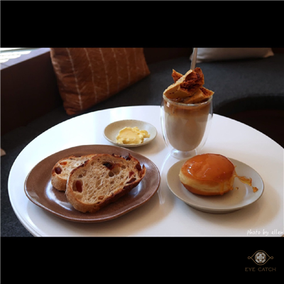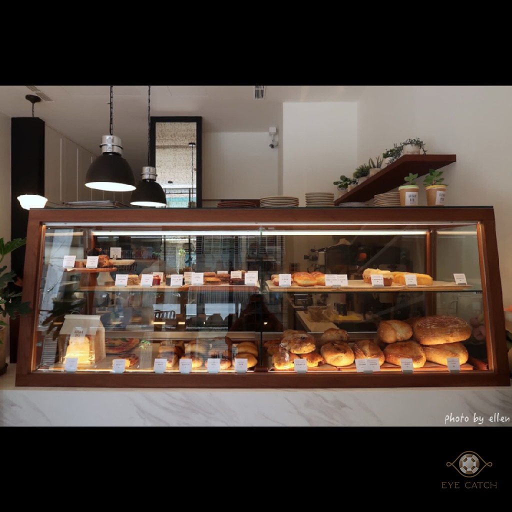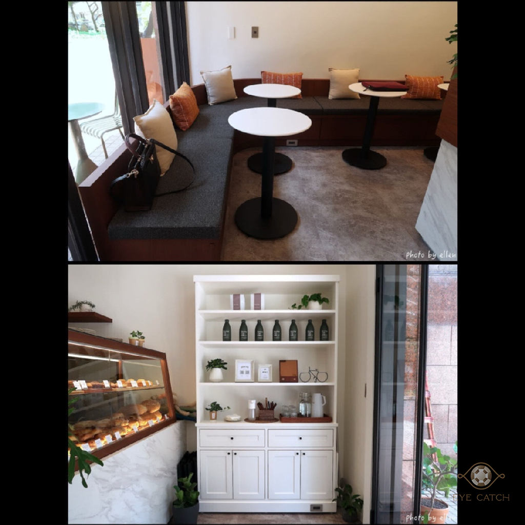 進門是玻璃展示櫃, 各式各樣麵包糕點從酸種硬麵包貝果吐司到甜甜圈杯子蛋糕餅乾都有, 與早午餐店一樣偏美式, L字型沙發座位幾張圓桌, 座位底下插座可以用, 當天有1-2位帶筆電來, 內用低消一杯飲品, 用餐限時90分鐘
