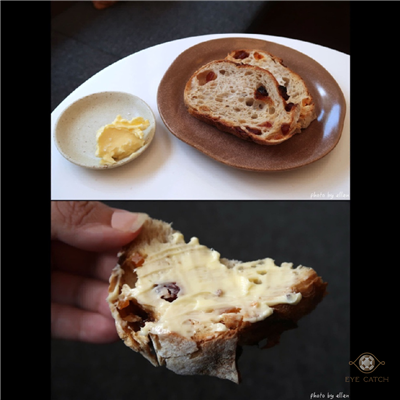 切片麵包為每日限定口味, 這天是無花果杏桃, 海鹽奶油質地滑順, 完全室溫狀態非常好抹, 麵包外層薄脆中間濕潤鬆軟有彈性, 無花果蔓越莓杏桃乾酸甜滋味豐富, 奶油奶香濃厚, 兩者完美結合