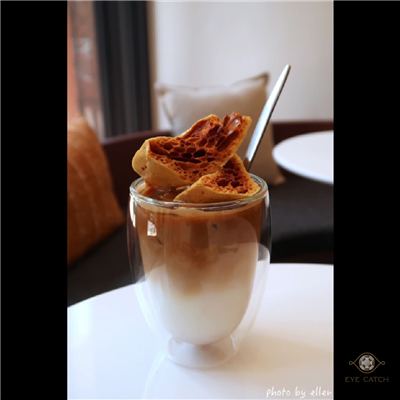 咖啡偏苦僅一咪咪酸, 牛奶融合不錯, 配甜點剛剛好! 焦糖肉桂蘋果派附奶油威士忌冰淇淋, 蘋果派回烤是熱的, 冰淇淋遇熱蠻快融化要盡快吃, 派皮酥脆中間層酥鬆, 蘋果片煮過有糖香同時仍保有清脆口感, 冰淇淋淡淡威士忌香氣酒精味不會太重, 和蘋果派一起享用增添奶香與酒香, 加上點綴的菠蘿酥與杏仁片, 味道十分豐富