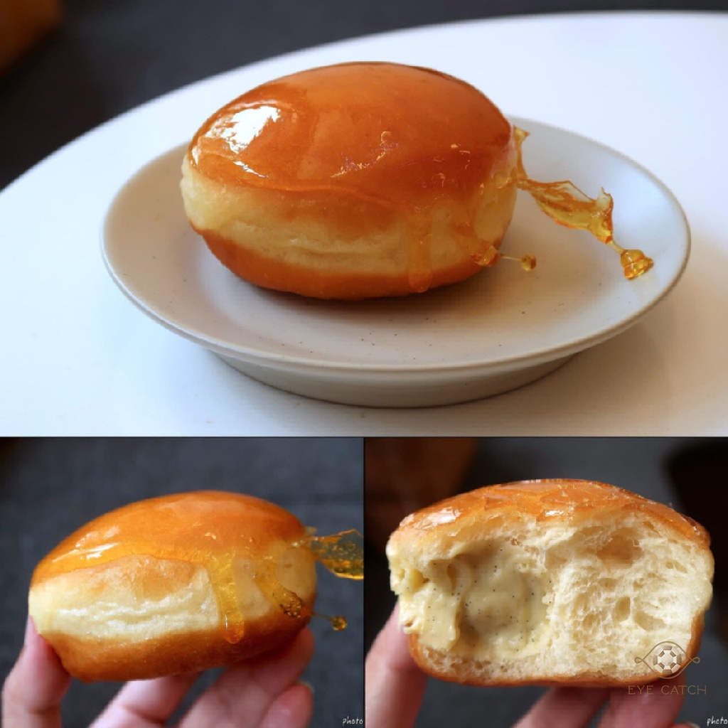 焦糖脆脆拿鐵, 拿鐵本身是苦的, 像吃咖啡粉的苦味, 脆脆單吃苦味亦明顯, 還好融化後與拿鐵融合, 咖啡的苦會不見, 變得順口好喝! 脆焦糖香草卡士達甜甜圈十分柔軟, 上層脆糖不會太厚, 卡士達香草籽爆多