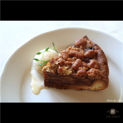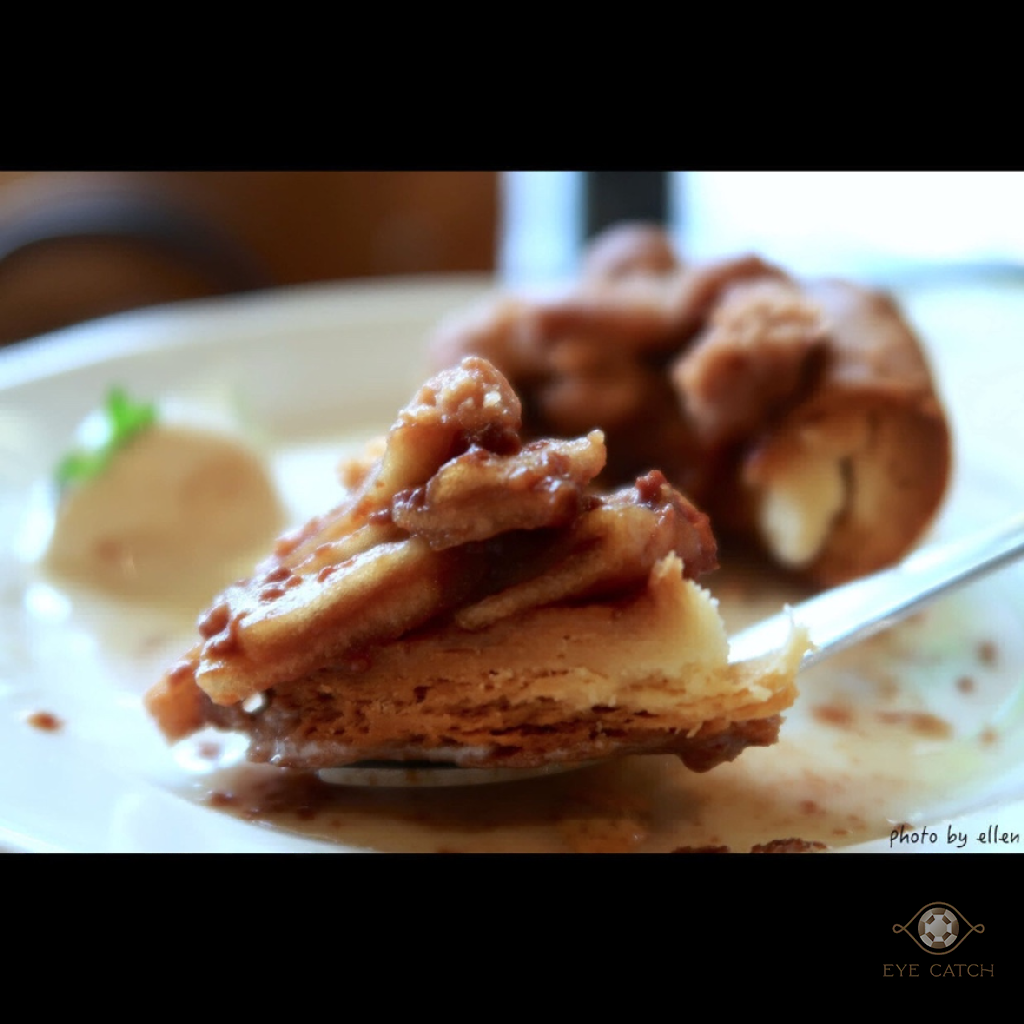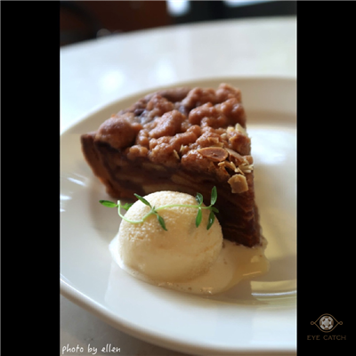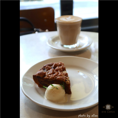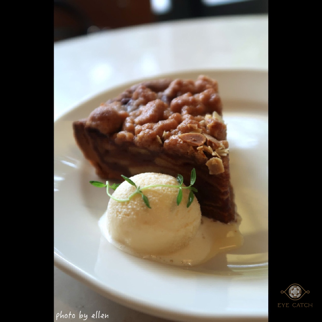 咖啡偏苦僅一咪咪酸, 牛奶融合不錯, 配甜點剛剛好! 焦糖肉桂蘋果派附奶油威士忌冰淇淋, 蘋果派回烤是熱的, 冰淇淋遇熱蠻快融化要盡快吃, 派皮酥脆中間層酥鬆, 蘋果片煮過有糖香同時仍保有清脆口感, 冰淇淋淡淡威士忌香氣酒精味不會太重, 和蘋果派一起享用增添奶香與酒香, 加上點綴的菠蘿酥與杏仁片, 味道十分豐富