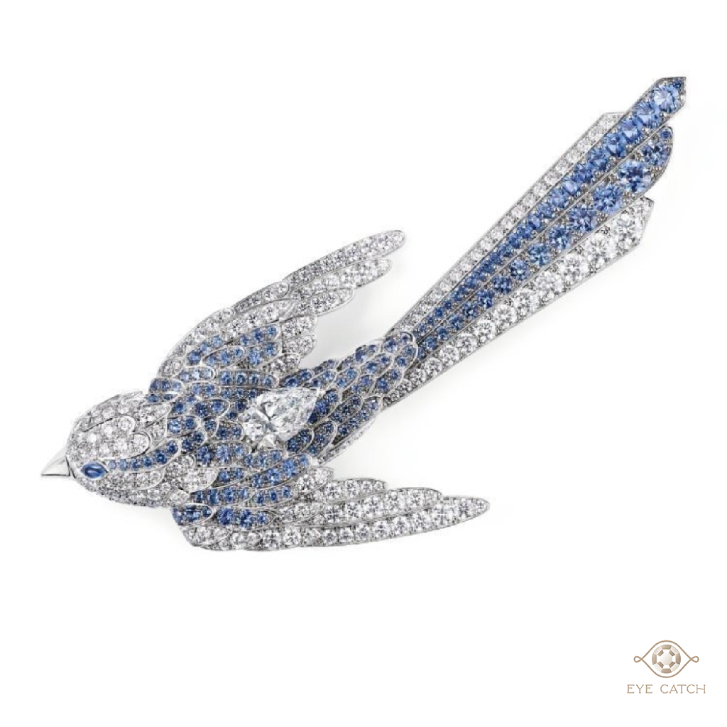 其中一件山雀(Chickadee)造型胸針,創作靈感來自生活在北美地區的小型鳥類,設計師別出心裁地塑造出山雀俯衝而下的飛翔姿態,鑲嵌圓形切割藍寶石勾勒出分明的羽毛紋路,中央鑲嵌一顆超過1ct水滴形鑽石,經鑒定為 E 色和 VVS2 淨度營造出熠熠閃光。尖尖的鳥喙採用鏡面拋光白金潤飾,搭配弧面切割的藍寶石眼眸,純淨動人,如同帶來幸運的珍寶