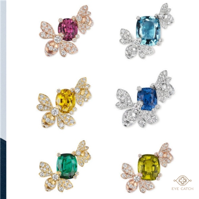 其中的戒指品項,以一顆三角形切割彩色寶石為主石,搭配鑲嵌階梯型切割寶石的永恆式戒圈,並推出四種撞色/互補色配色的珠寶作品。
