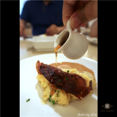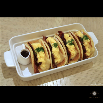 其中鬆餅塔可一份四組, 我們一人一個剛剛好, 鬆餅鬆軟濕潤有奶香, 培根沒有預期酥脆而是硬帶韌還好不會太難咬, 中間炒蛋滑嫩可口, 搭配融化起司與蝦夷蔥再淋微辣的楓糖漿, 莫恩斯特起司融化後會牽絲, 和培根屬於不同的鹹香讓味道層次更豐富, 甜鹹甜鹹我喜歡, 但吃一組就差不多了 XD