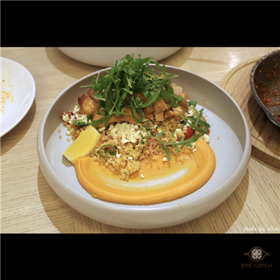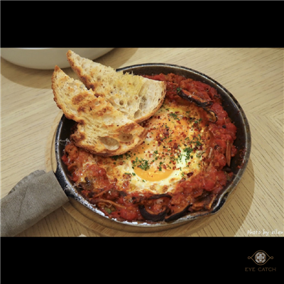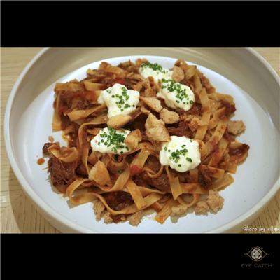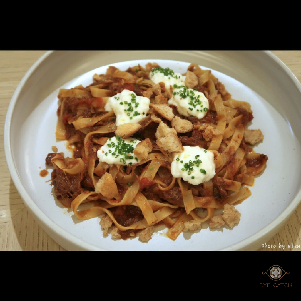 小點/新鮮生菜/早午餐/特色料理/甜甜的, 朋友各選自己想吃的打算點來share, 吃完感想果然分享好, 每道菜雖說調味不錯但吃多易膩, 大家分食最好吃! 我們點了: 鬆餅塔可, 牛頰肉醬寬扁麵, 義式鐵鍋燉蛋, 香料雞肉沙威瑪與鷹嘴豆泥