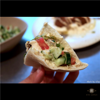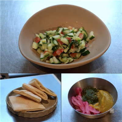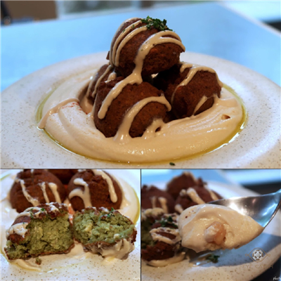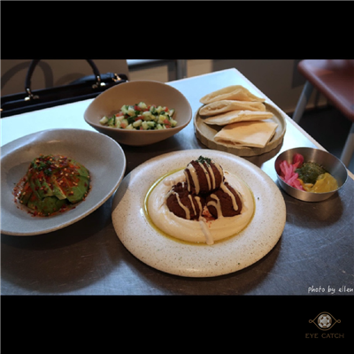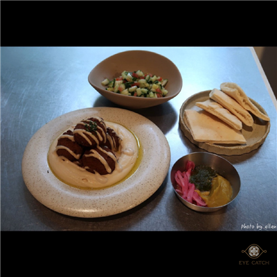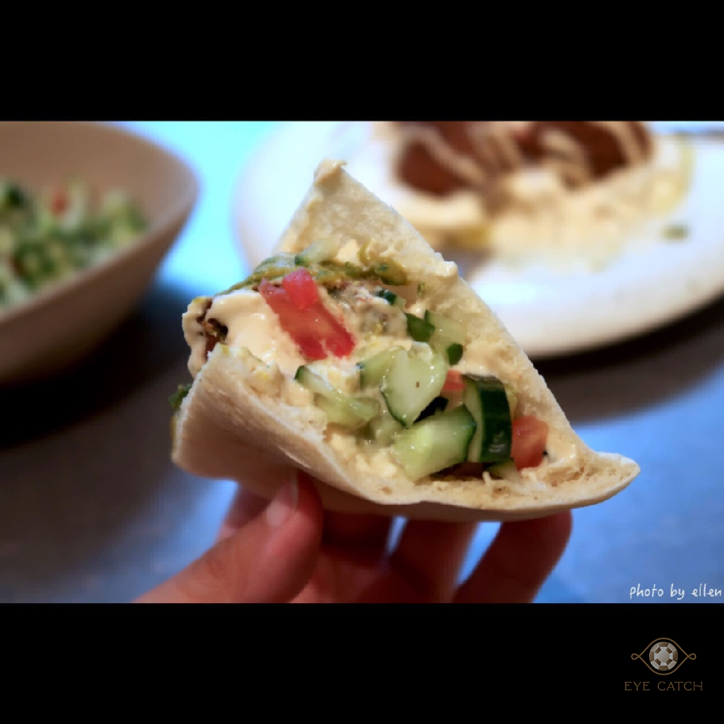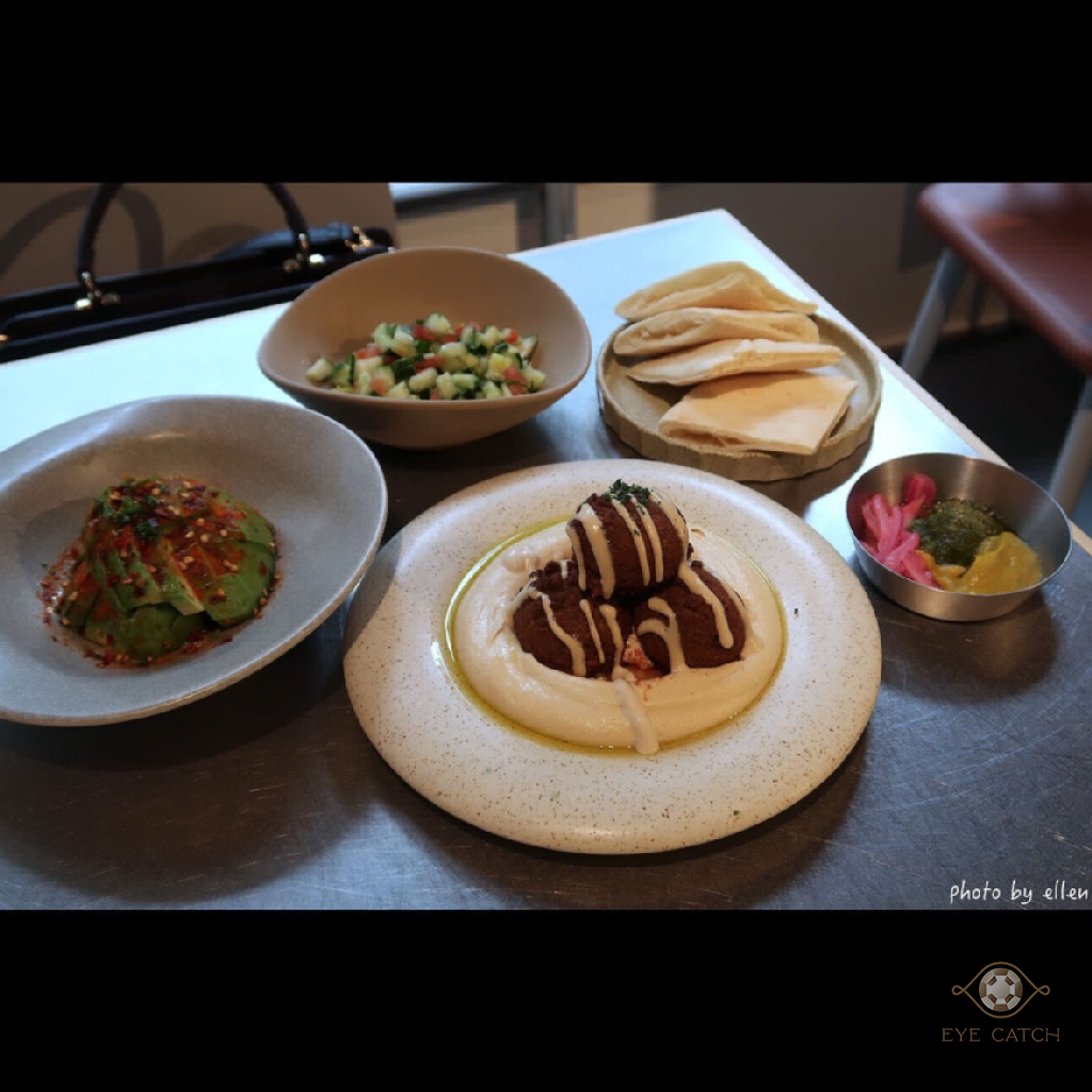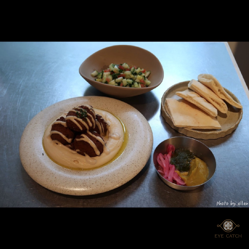 Falafel是炸鷹嘴豆蔬菜球一份四顆, 外層炸到酥脆, 裡面蔬菜剁得細碎同時保有顆粒口感, 鷹嘴豆泥綿密滑順近似抹醬質地, 橄欖油與芝麻香氣明顯, 咬到鷹嘴豆時豆味較突出