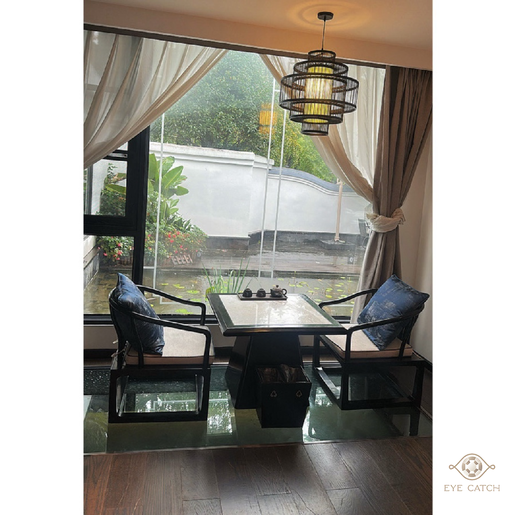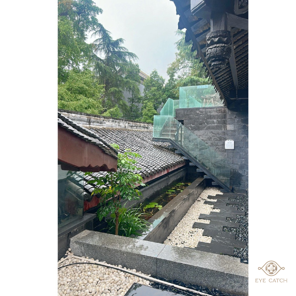 最喜歡的是窗邊的品茶角落,落地玻璃外就是雨中的小庭院,綠意、池水與白牆交織出江南般的安寧。坐在這裡喝茶,時間彷彿放慢,只剩雨聲與茶香陪伴,是旅程中最放鬆的片刻。