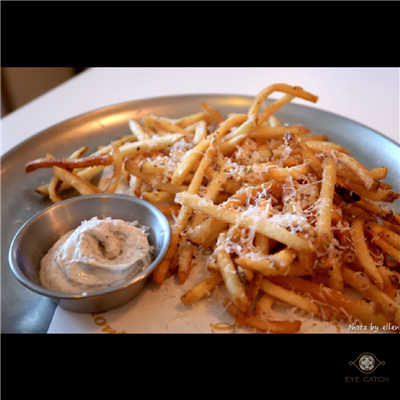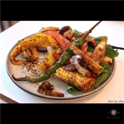 薯條是shoestring fries, 超細超脆即使放到涼稍微潤掉仍保持明顯脆度~ 松露美乃滋不是台式美乃滋調的但也不像蛋黃醬, 松露味明顯, 不知為何有點像肝醬的味道, 和之前吃過的松露美乃滋很不同; 烤蔬菜和想像的不太一樣, 烤的香氣略不足