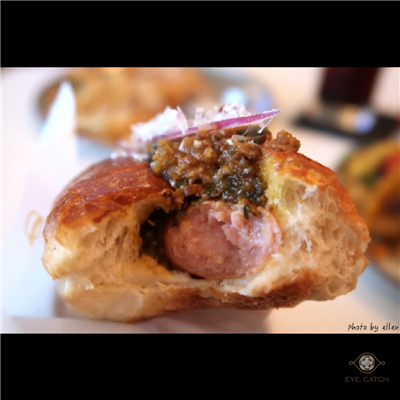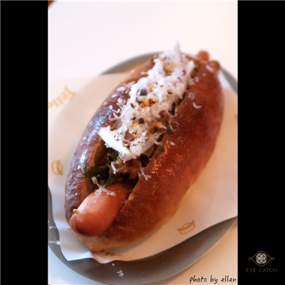 熱狗的辣肉醬看似普通沒想到真的挺辣, 麵包口感好, 表面焦脆裡頭Q又有彈性, 熱狗腸脆且多汁, 辣肉醬外還有一些香料不太像西式調味, 很重的香草香菜在其中, 有自己的特色