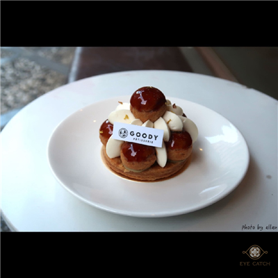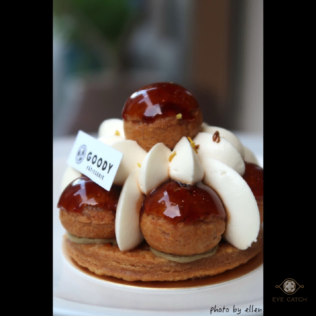 桂花鐵觀音聖多諾外型漂亮, 底下是千層酥餅, 小顆焦糖泡芙裡夾鐵觀音奶油餡, 白色桂花香緹十分輕盈, 中間還有鐵觀音馬斯卡彭乳酪與酥餅搭配挺好, 喜歡茶香的表現
