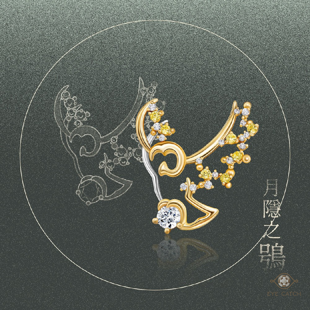 Pure Diamond以此意象為核心,將草鴞柔軟羽翼的線條化為充滿生命力的流動弧度,以黃K金呈現牠溫暖、靈動的姿態,再鑲嵌明亮式培育鑽石,彷彿草鴞在夜空中托起光茫
