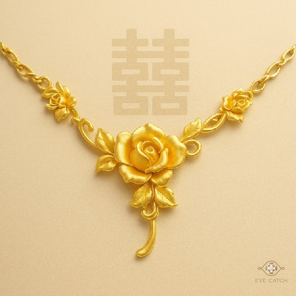 這款「浪漫黃金項鍊」。本款商品一兩以上,重量感十足,線條卻依然柔美,細緻雕出盛開玫瑰與葉瓣,像是將浪漫瞬間凝結在頸間。走進婚宴、派對或拍攝婚紗,無需大聲宣告,氣勢自然盛放。