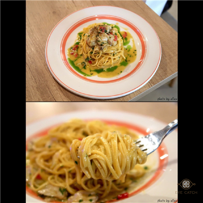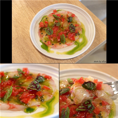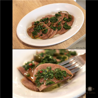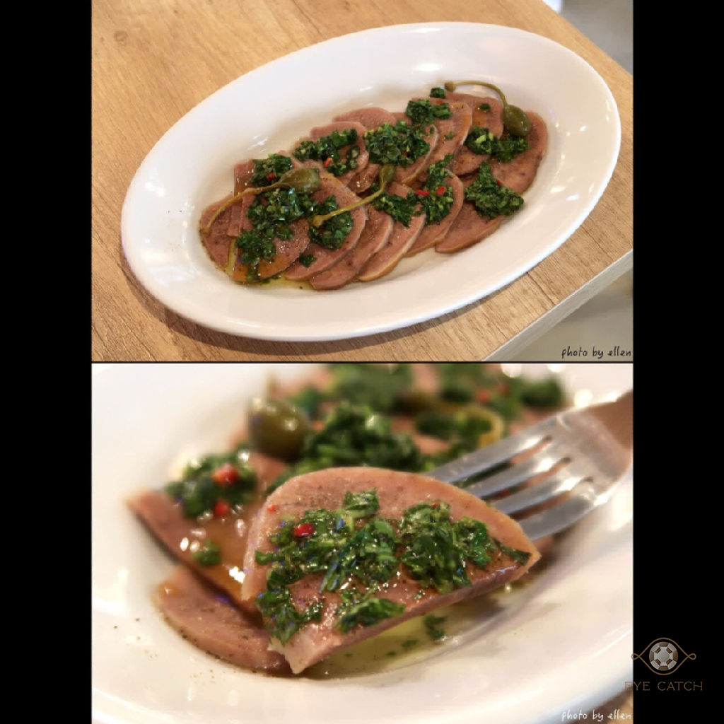 餐點我點了: 胭脂蝦塔塔/百香果, 自家製手工香料肉腸, 塩水牛舌/香草綠醬, 特大蛤手工純雞蛋麵; 其中肉腸是四道裡最香的一個, 牛舌軟脆軟脆微Q口感好, 蛤蜊鮮味濃郁生嫩好咬, 義大利麵麵量一個人吃剛好, 其它前菜可兩人分食, 量不算多, 跟我一樣一個人吃也行 ;)