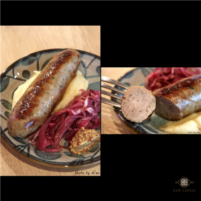 熱狗的辣肉醬看似普通沒想到真的挺辣, 麵包口感好, 表面焦脆裡頭Q又有彈性, 熱狗腸脆且多汁, 辣肉醬外還有一些香料不太像西式調味, 很重的香草香菜在其中, 有自己的特色
