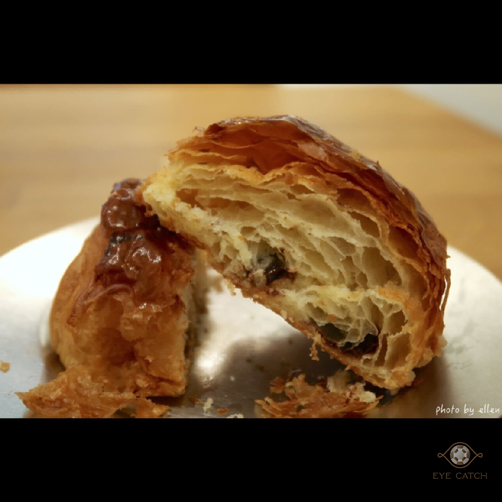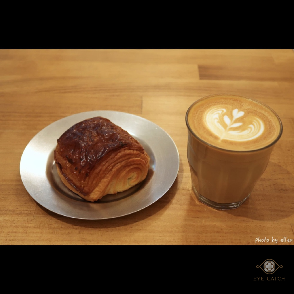 拿鐵中焙對來我說苦味還是太搶眼, 拿來配巧克力可頌倒不錯! 巧克力可頌有回烤, 孔洞大十分鬆軟整體口感偏乾, 中間可可豆量雖不多, 不完全甜的微苦風味挺好, 與咖啡的苦可做個中和