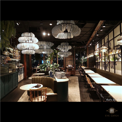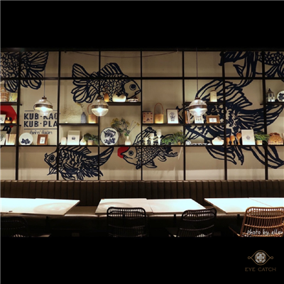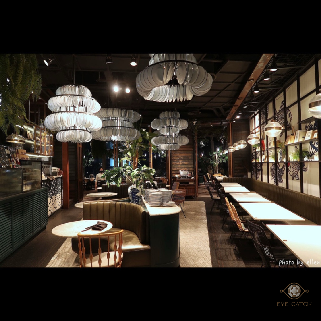 夜晚的ICONSiam燈光與倒影金光閃閃, 接連幾個偌大精品招牌更讓建築物顯得金碧輝煌! 逛一圈後朋友決定吃Kub Kao Kub Pla, 這間餐廳在曼谷有非常多分店, 許多商場都有, 主打泰式家常料理不過也有賣義大利麵之類~ 商場裡的店鋪裝潢不馬虎, 維持一貫風格, 可能因為新看起來更精緻, 晚餐高峰時間已過, 餐廳一半位子空出來大多尚未整理, 還好只需稍微等候清理桌面即可入座