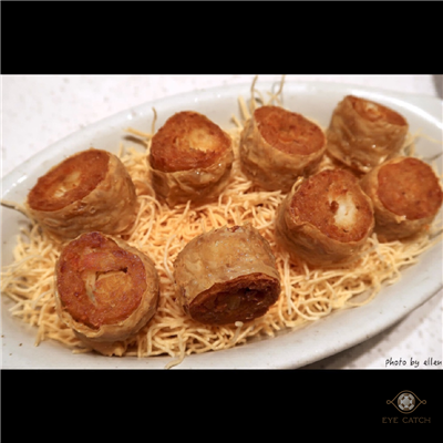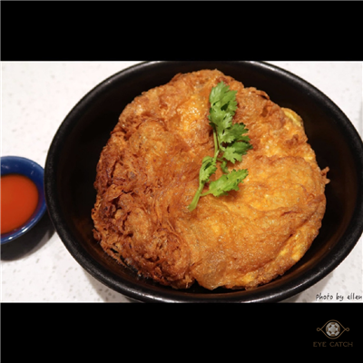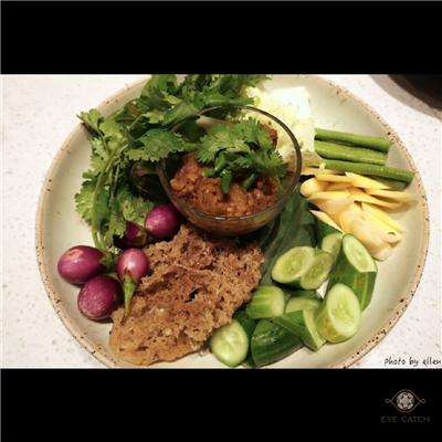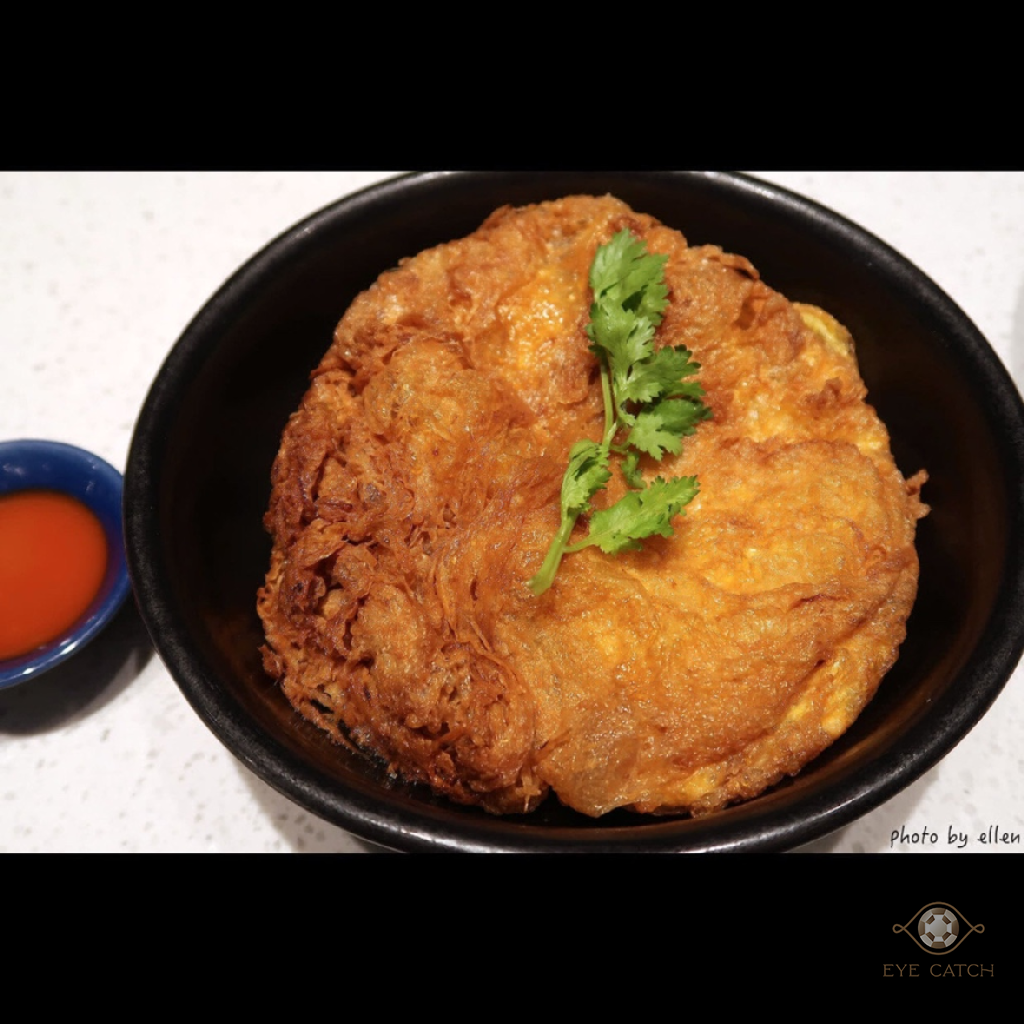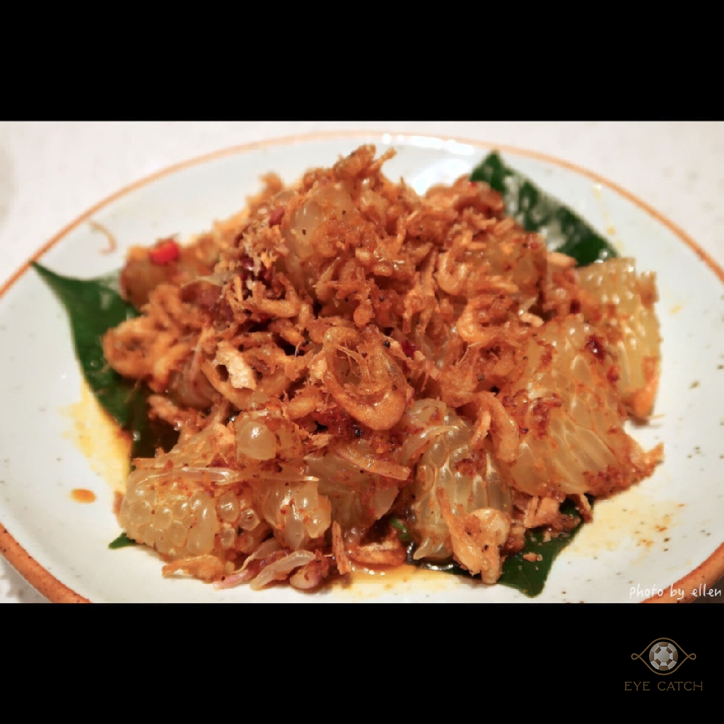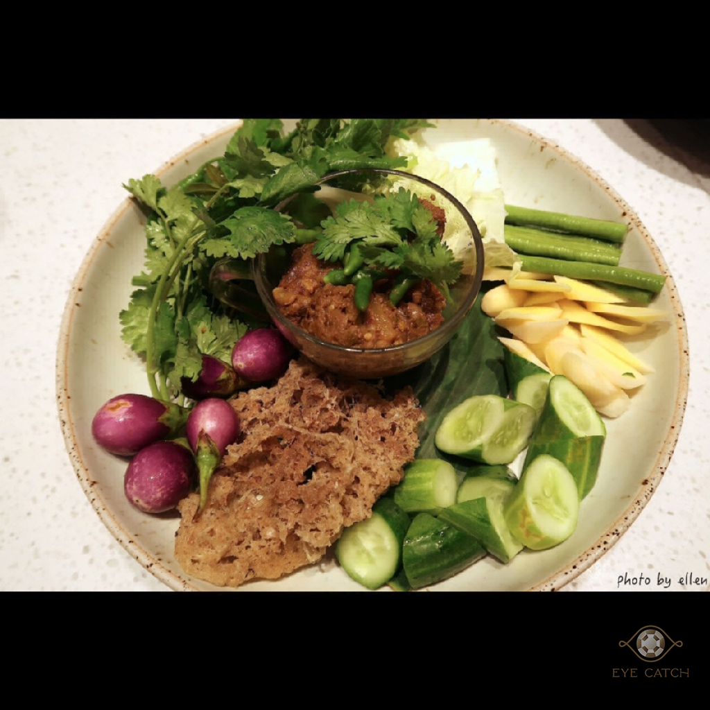 點了幾道: 蒜炒空心菜, 泰式香辣羅望子醬配脆香古拉米魚和新鮮蔬菜, 蝦仁柚子沙拉, 黃金蟹球, 蝦仁煎蛋; 其中古拉米魚小到讓人訝異, 黃金蟹球則是表現最好! 腐皮包大塊蟹肉炸, 有腐皮豆香還有軟嫩飽滿的蟹肉, 但整體來說還是之前介紹的Baan Somtum表現更好