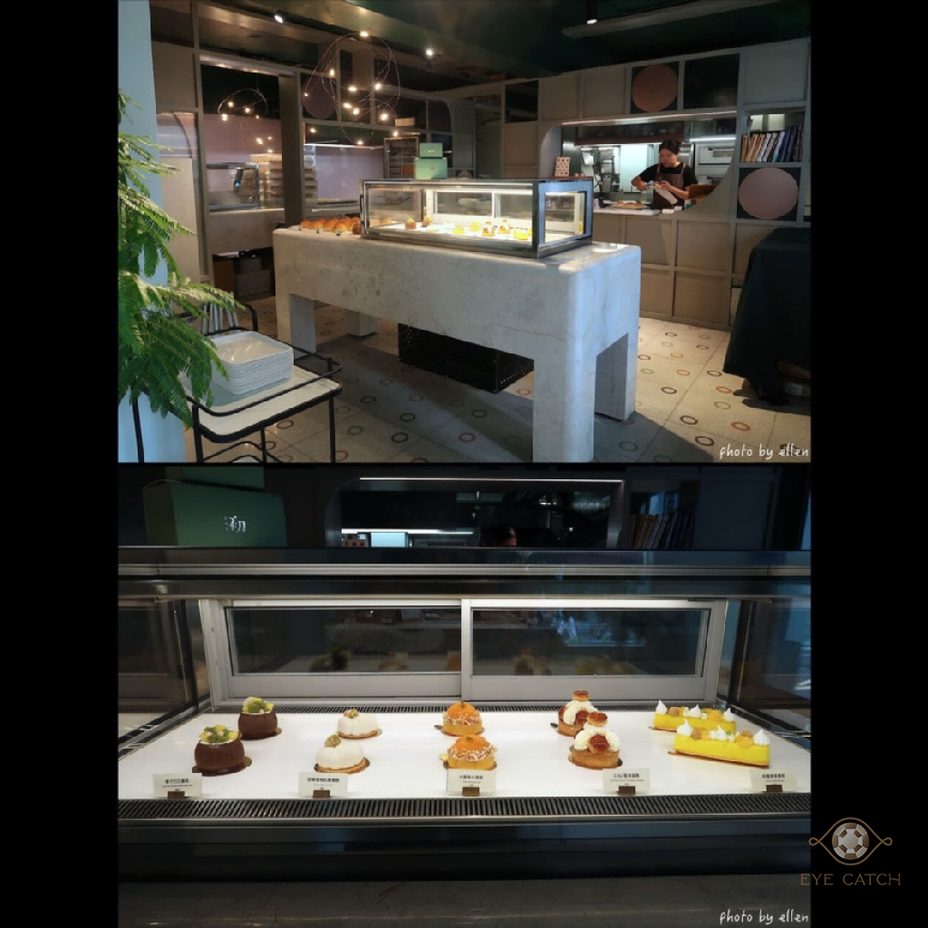 裝潢簡單有質感, 店內無座位, 中間中島展示甜點與塩可頌, 乍看東西好像不多, 後方的廚房工作區域呈L型佔據大部分空間, 轉頭一看原來角落櫃子還有麵包, 每天推出品項不太一樣