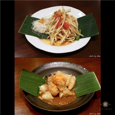 點了幾道: 蒜炒空心菜, 泰式香辣羅望子醬配脆香古拉米魚和新鮮蔬菜, 蝦仁柚子沙拉, 黃金蟹球, 蝦仁煎蛋; 其中古拉米魚小到讓人訝異, 黃金蟹球則是表現最好! 腐皮包大塊蟹肉炸, 有腐皮豆香還有軟嫩飽滿的蟹肉, 但整體來說還是之前介紹的Baan Somtum表現更好