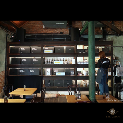 兩層樓挑高空間, 進門左手邊看到的是商品展示區與開放式廚房, 建築物中有建築物, 木造棚架搭建出小木屋, 不僅如此, 還在天花板貼滿金屬片佈置出明亮戶外的感覺, 若不是知道自己身在市區, 還以為來到哪個鄉村了 XD