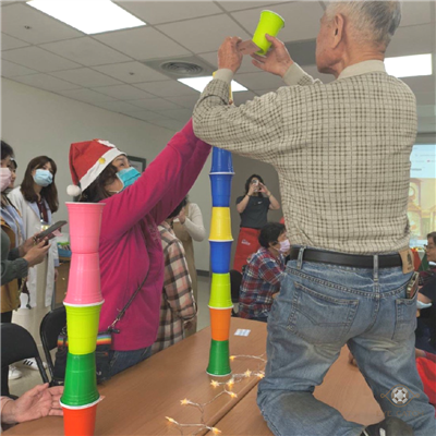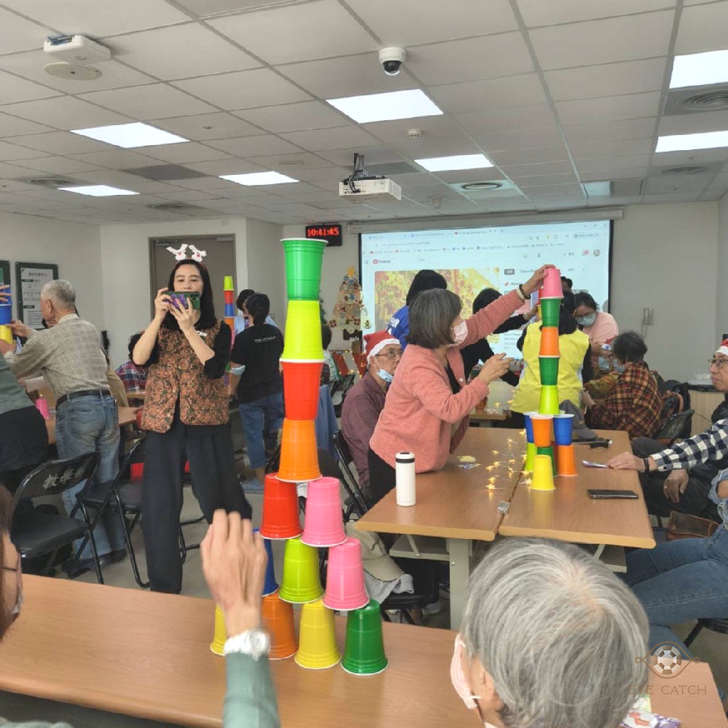 遊戲間隙,彩色杯子塔悄悄登場,紅、黃、藍、綠一路往上疊,手抖一點就全倒,但沒關係,倒了再來,全場笑到不行。