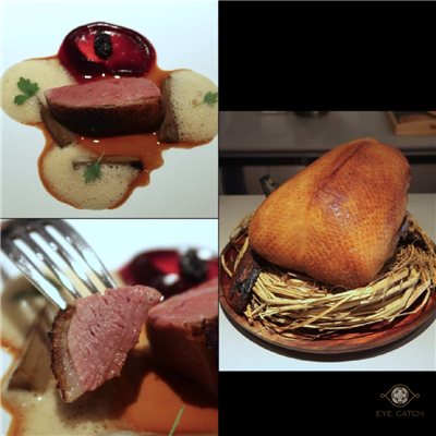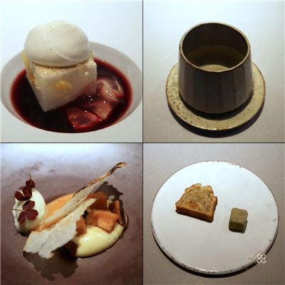 飲料有: 薑汁檸檬康普茶, 咖啡洛神接骨木花, 芭樂白巧克力蕎麥, 蔓越莓胡椒杜松子; 餐點有: 葡萄蝦, 真鯛, 法國奶油昆布鹽餅乾脆片&酸種麵包, 鍋燒意麵茶碗蒸, 馬頭魚, 鱈魚白子, 胭脂鴨, 柚子慕斯, 萬壽菊香蜂草薄荷混合花草茶, 柿, Petit four